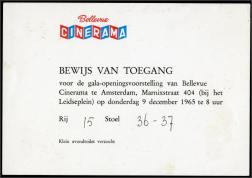 "Het theater [blijft] met Cinerama Rotterdam exclusief voor Nederland in zijn soort: kijkspel op een kolossaal, aan de zijkanten enigszins de zaal inbuigend, doek en geluid ‘waar u middenin zit'... En een belangrijke technische perfectionering is er de oorzaak van dat Amsterdam met Cinerama een paar jaar achter Rotterdam loopt: men heeft in de hoofdstad gewacht op de zogenaamde ‘één-lens-projectie' waardoor de strepen over het doek die het beeld vroeger... in drieën verdeelden verdwenen zijn. Mr. P[iet] Meerburg, mede-directeur van Bellevue Cinerama dat met de televisie-studio het vroegere Bellevue-complex beslaat, zegt: ‘We waren er eerst bang voor dat de aanvoer van Cinerama-films beperkt zou blijven. Door de nieuwe produktie- en projectie-mogelijkheden is dat gevaar voorbij en nu kunnen we hier ook 70mm-films vertonen met een nauwkeurig Cinerama-effect'." volgens Henk ten Berge [Telegraaf, 19-11-1965].